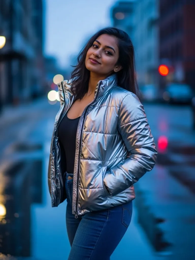 A shiny silver puffer jacket layered over a simple black top and classic jeans makes a bold statement.