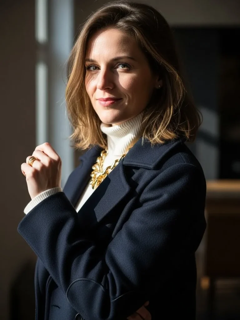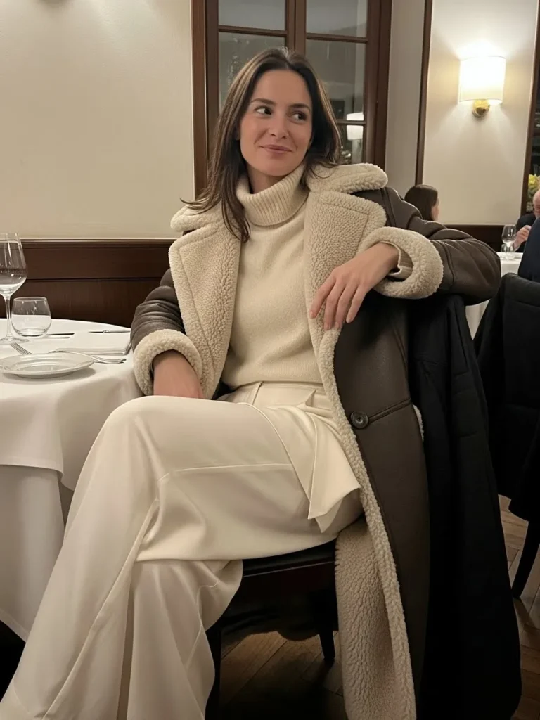 A cozy cream turtleneck layered under a tailored dark coat creates a clean and elegant silhouette.