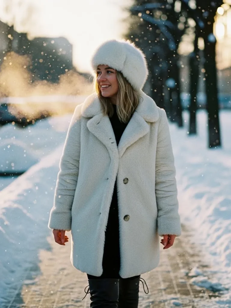 A soft white coat paired with a fluffy matching hat creates a dreamy winter night outfit.