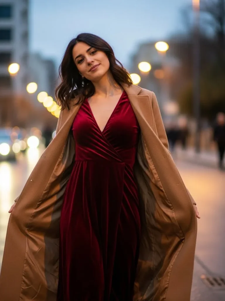 This outfit showcases a deep red velvet wrap-style dress layered under a flowing camel coat. The soft fabric of the dress feels romantic and rich, while the neutral outer layer keeps the look balanced and season-appropriate for colder evenings.