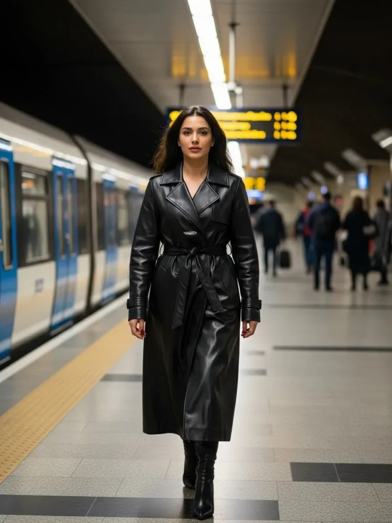 A long black leather trench coat takes center stage paired with black boots for a bold and edgy look.