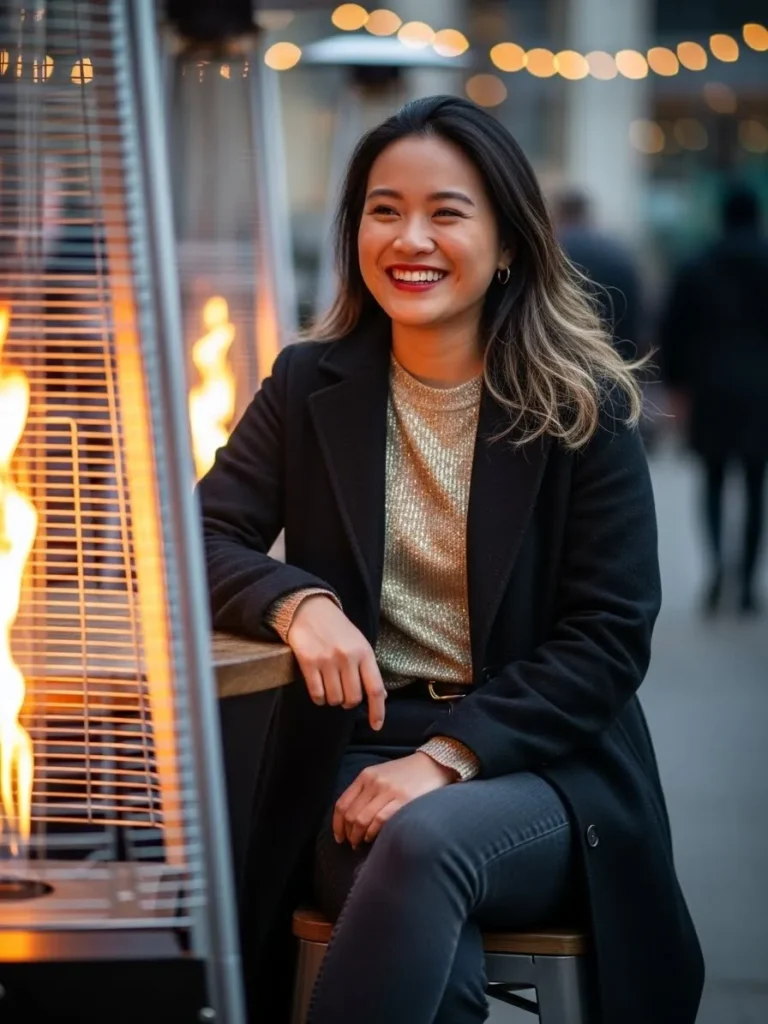 A black coat layered over a shimmering metallic top and dark jeans creates a perfect balance of cozy and glam.