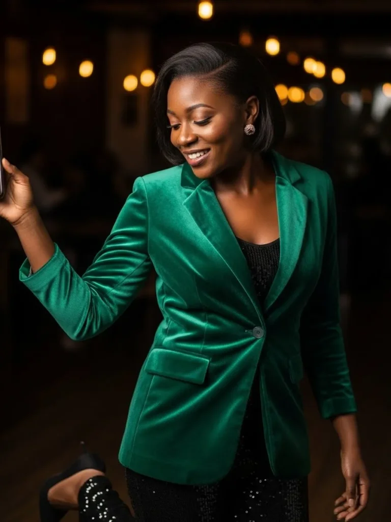 This outfit features a rich emerald velvet blazer layered over a black sparkly top and slim black pants.