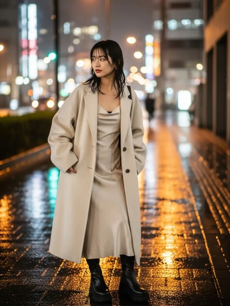 A soft cream slip dress layered under a long matching coat creates a smooth and elegant silhouette.