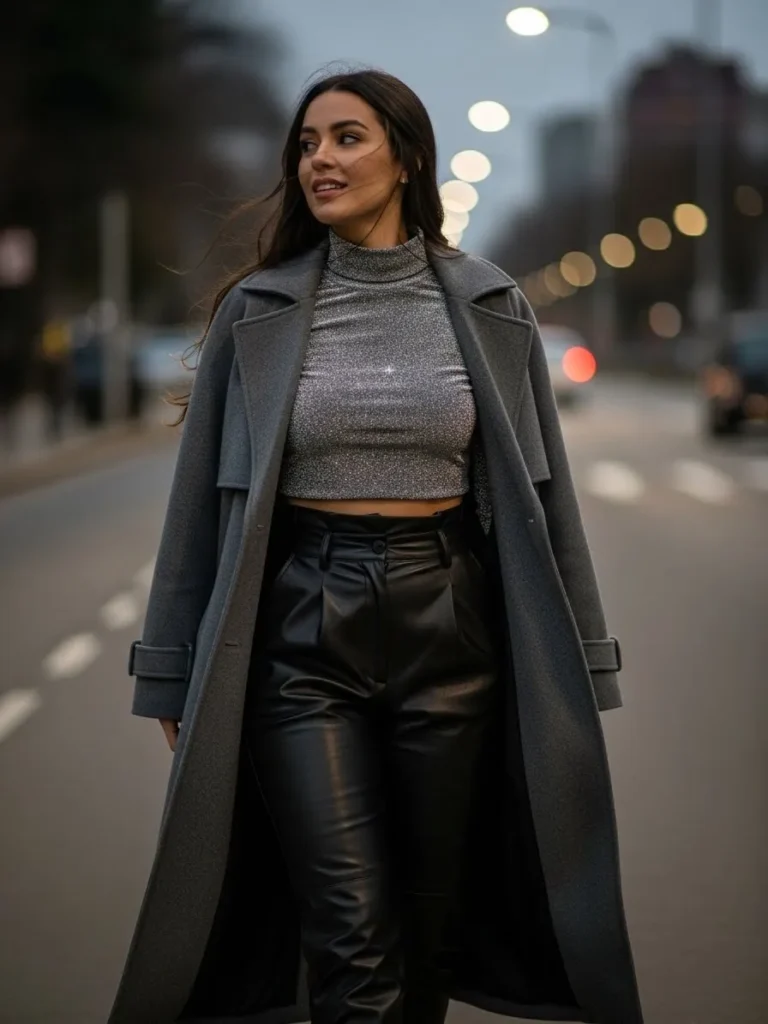 A long gray coat adds warmth and movement while keeping the look sleek and night ready.