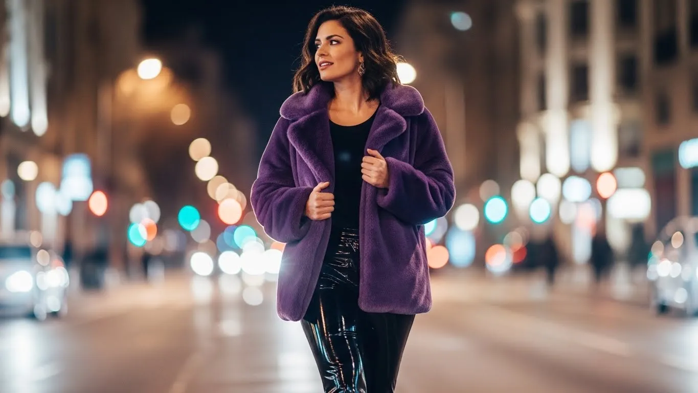 A black coat layered over a shimmering metallic top and dark jeans creates a perfect balance of cozy and glam.