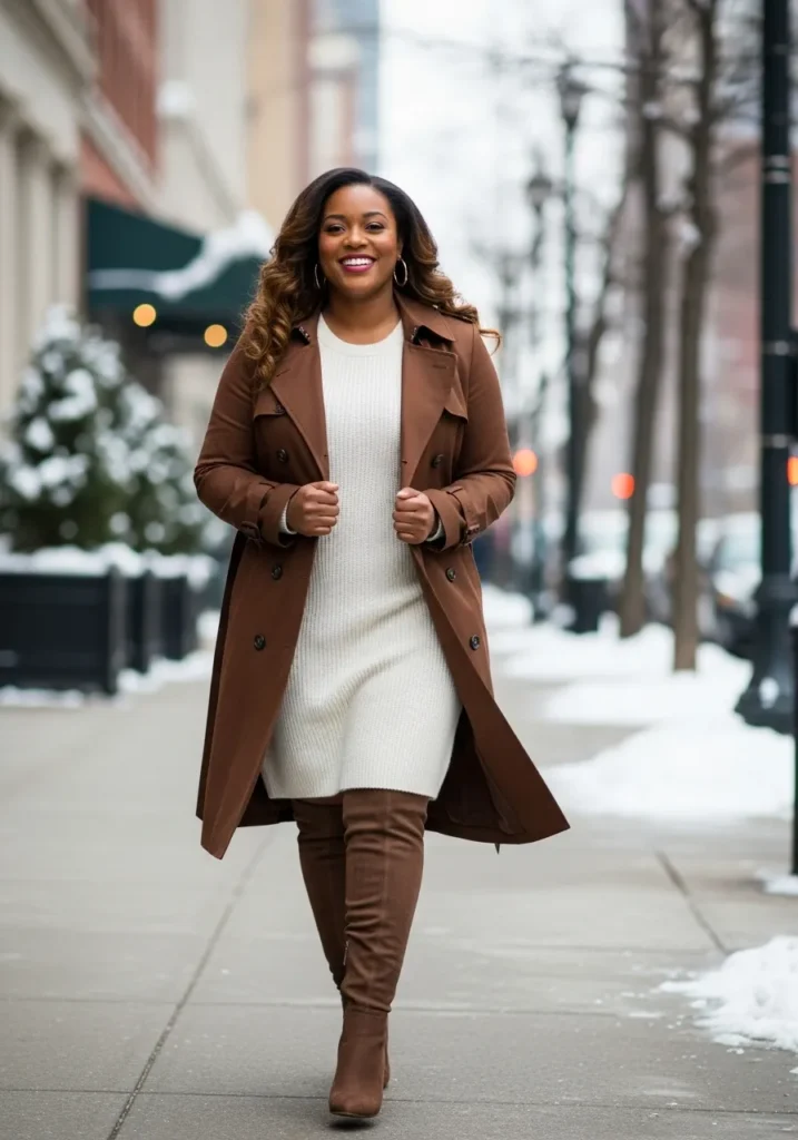 This outfit pairs a soft cream knit sweater dress with a rich camel trench coat that adds instant polish. The dress looks warm and comfy with a simple ribbed texture that feels perfect for a cold day. She finishes the look with matching camel over the knee boots that pull everything together in such a seamless way. The whole vibe feels classy, effortless, and totally winter ready.