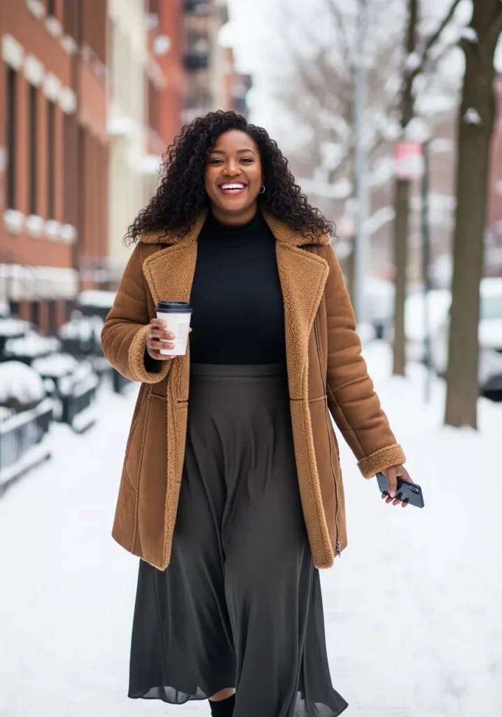 This outfit is such a beautiful blend of cozy textures and effortless style. She is wearing a warm camel teddy coat with that plush, soft lining that instantly makes you feel snug just looking at it. Underneath, a simple black turtleneck creates a clean base while the flowy deep olive skirt adds a little movement with every step. The whole look feels comfortable yet polished, especially paired with her curls, a bright smile, and that essential winter accessory… a hot coffee.