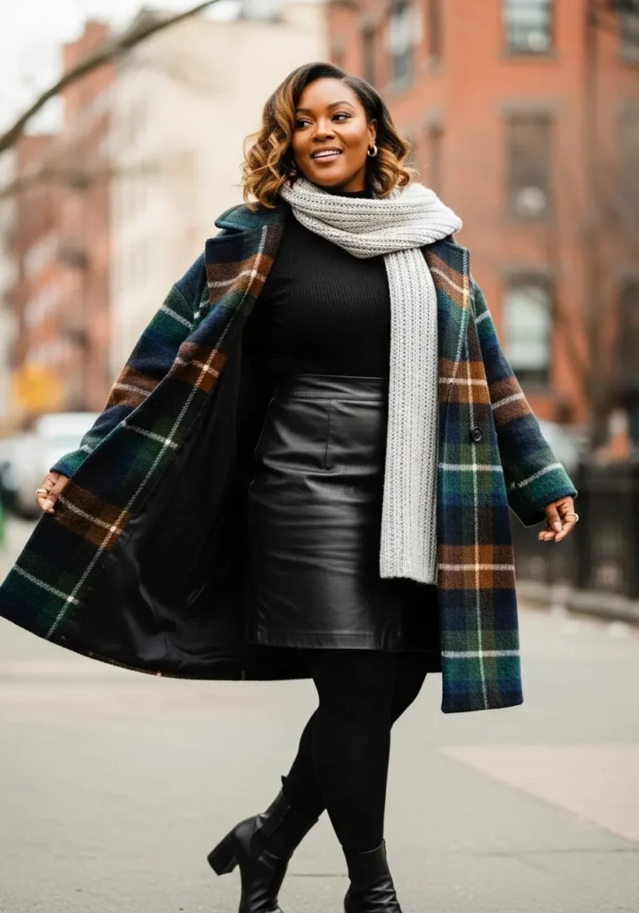 I love how this outfit works because it balances structure and softness so beautifully. The plaid coat makes a statement without overwhelming the silhouette, and the leather skirt gives the whole look a chic edge. The scarf draws the eye upward and frames the face in the sweetest way. It feels flattering, put together, and honestly like something I’d wear on repeat all winter long.