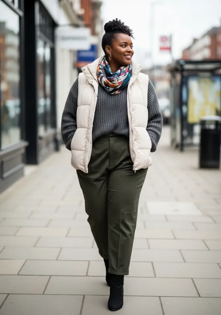 This outfit brings together a warm chunky grey sweater paired with olive green tailored trousers that give the whole look a polished but effortless vibe. The soft cream puffer vest adds that perfect touch of winter coziness without looking bulky. A colorful printed scarf sits beautifully around her neck and adds just the right amount of personality to the muted tones. Black ankle boots complete the look with a sleek finish. The textures feel soft and warm, and the whole outfit has that relaxed yet put-together energy that makes winter dressing feel fun instead of fussy.