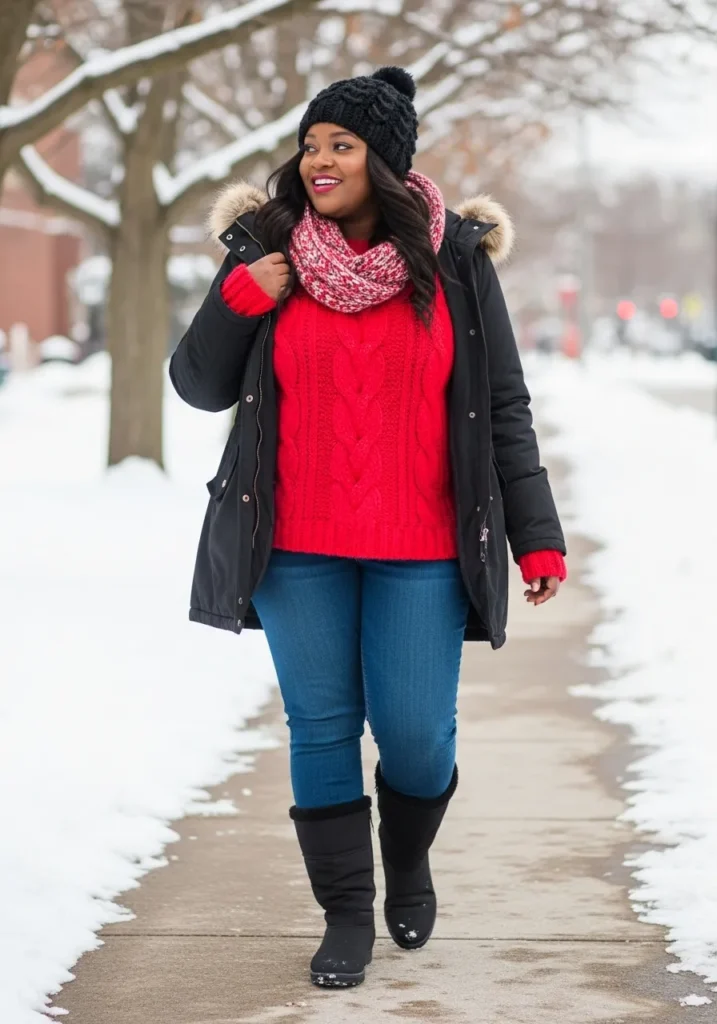 This look is all about bright winter cheer with a bold red cable knit sweater taking center stage. The chunky texture adds that perfect cozy feel, especially paired with a soft multicolored infinity scarf that pulls the whole palette together. The black parka with a faux fur hood gives the outfit a warm and practical layer while still feeling cute for a casual winter stroll. She finishes everything with fitted blue jeans, classic black winter boots, and a knitted pom beanie that ties into the jacket and keeps things super snug.