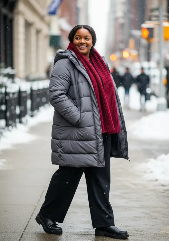 This outfit brings together everything I love about practical winter fashion with a soft touch of bold color. The long charcoal puffer coat feels warm and structured without looking bulky, and the length adds that extra bit of coverage we all appreciate on a snowy day. The deep burgundy scarf adds a gorgeous pop of rich color that instantly brightens the whole look. Paired with wide-leg black pants and chunky black winter boots, the whole vibe feels effortless, comfy, and totally ready for city sidewalks sprinkled with snow.