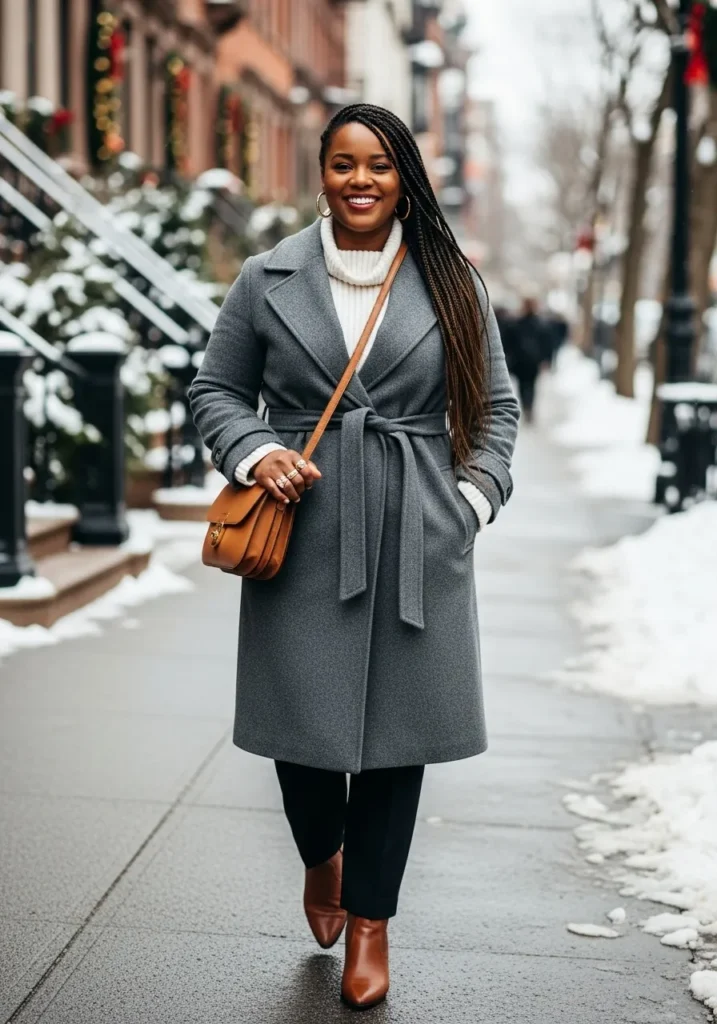 I love how this outfit mixes clean lines with soft textures. The wrap coat creates such a flattering shape, especially for curves, and the warm brown accessories make the grey feel richer and more intentional. The white knit brightens the face instantly. It’s one of those outfits that makes you feel pulled together the moment you put it on, even if you barely had time to grab coffee before running out the door.