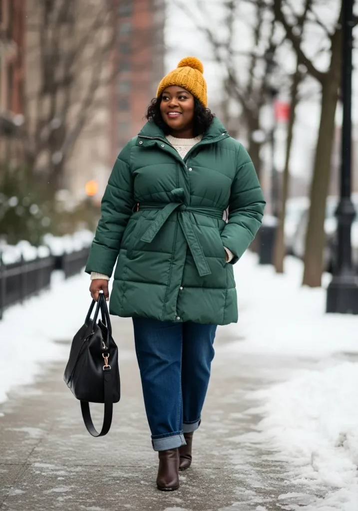 This outfit brings together all the winter pieces I reach for when I want to feel warm but still look wonderfully put together. She is wearing a deep green belted puffer coat that creates such a lovely shape even with all the padding. The coat pairs perfectly with classic cuffed blue jeans and dark brown ankle boots that keep the look clean and polished. The chunky knit mustard beanie adds the sweetest pop of color and the black structured handbag pulls everything together with a chic touch. The whole vibe feels comfy, confident, and totally ready for a snowy city stroll.