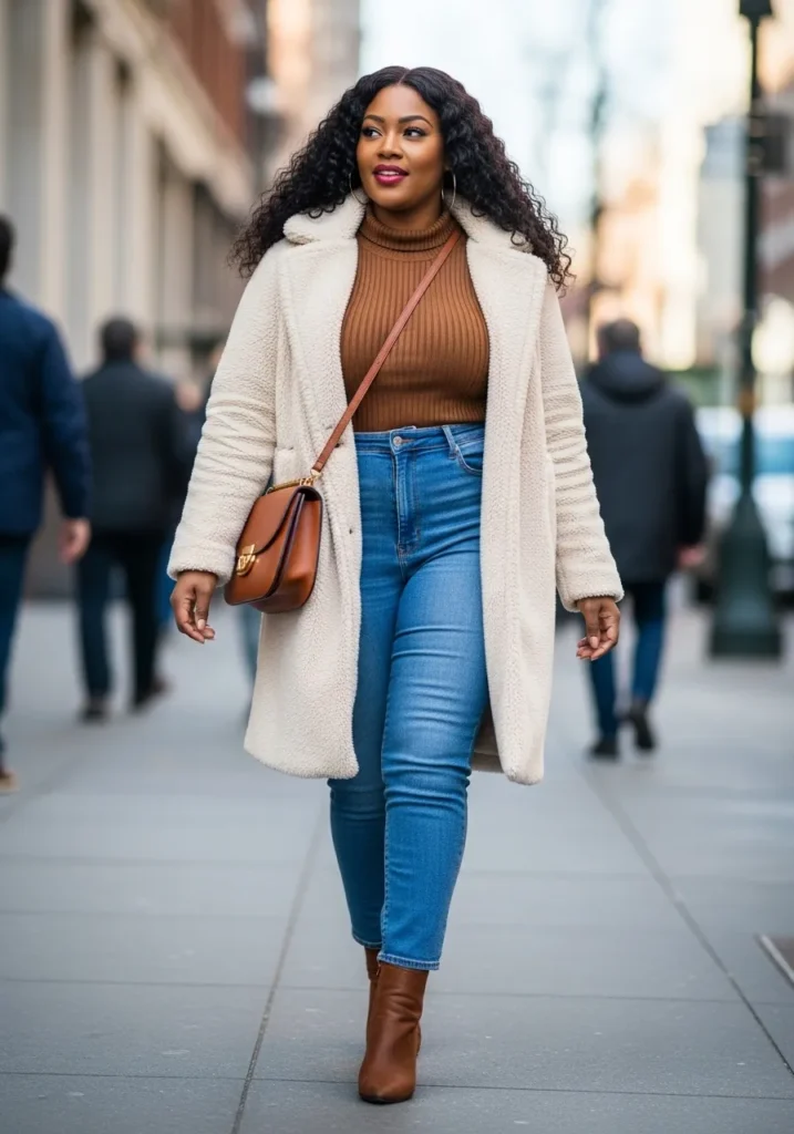 I love how this outfit balances comfort and confidence. The teddy coat adds volume in a cute, intentional way while the turtleneck and jeans create shape without feeling tight or fussy. The warm browns feel gorgeous on deeper skin tones and the little pops of leather make it look put together with zero effort. It is the kind of winter outfit that makes me feel stylish even when I am just running errands.
