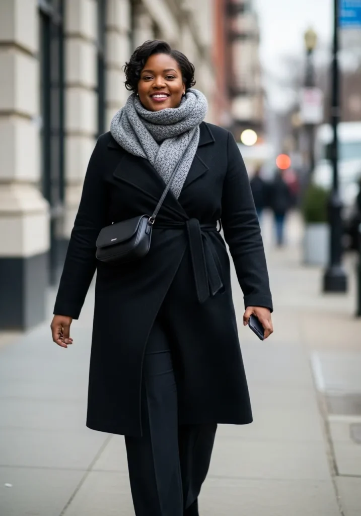 This outfit is the kind of winter look that feels polished without trying too hard. She is wearing a long black wrap coat with a soft, structured fabric that instantly gives that confident city energy. The coat ties neatly at the waist for a clean silhouette, paired with straight leg black trousers that keep everything streamlined. A chunky gray knit scarf adds warmth and beautiful contrast while still keeping the palette classy and simple. The small black crossbody bag sits perfectly at the front and adds a little modern edge. The whole vibe feels effortless, warm, and super put together for a cold day in the city.