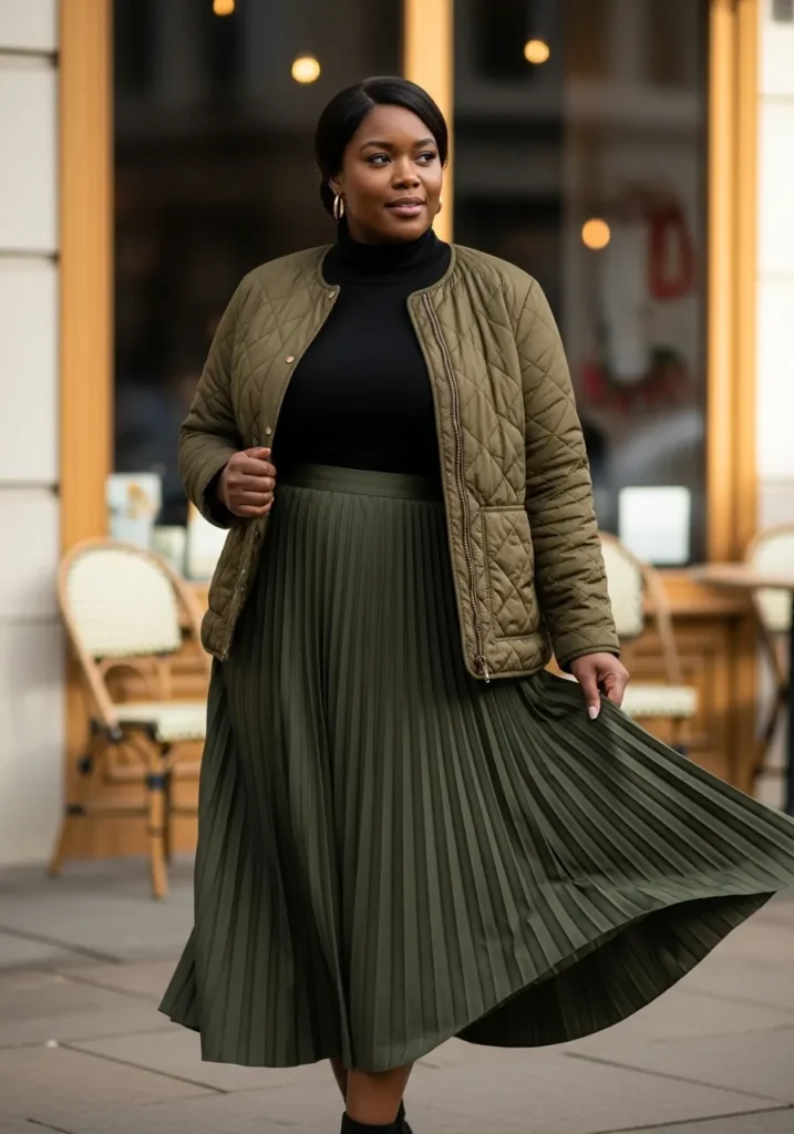 I love how this look feels both warm and put together without trying too hard. The pleated skirt adds so much movement and creates a flattering silhouette that highlights curves in the best way. The quilted jacket gives that chic layered feel without feeling bulky, which is always a winter win. It’s one of those outfits that makes you feel comfortable but still totally gorgeous.