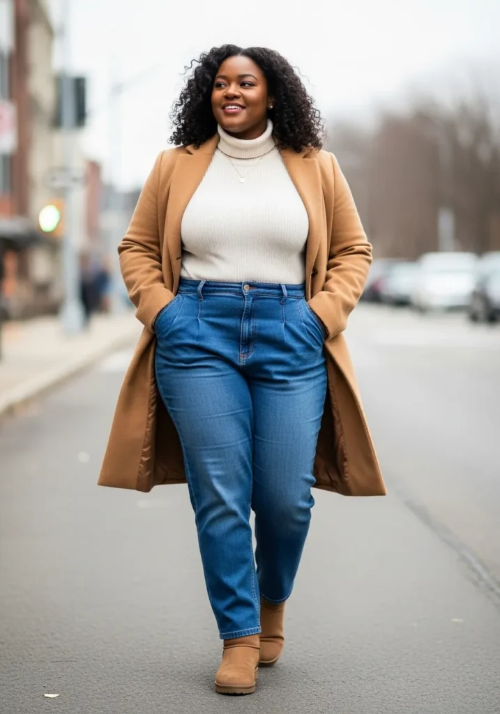 I love how this outfit manages to feel both classic and modern at the same time. The camel coat and cream knit create such a timeless color combo that flatters deeper skin tones beautifully. The high waist jeans define the shape in a subtle way that feels comfortable rather than fussy. Whenever I wear something like this, I feel warm, confident, and stylish without overthinking it. It is one of those looks that reminds you winter fashion can be simple and still feel amazing.