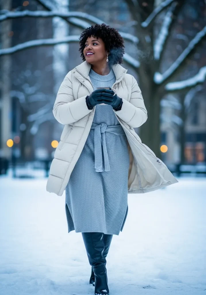 I love how this outfit mixes comfort and confidence in the easiest way. The knit dress shows curves without feeling clingy and the tie waist gives me that little definition I always want in winter layers. The cream puffer brightens the whole look and makes the gray feel intentional and chic. It is one of those outfits that feels warm, feminine and incredibly put together without much effort.