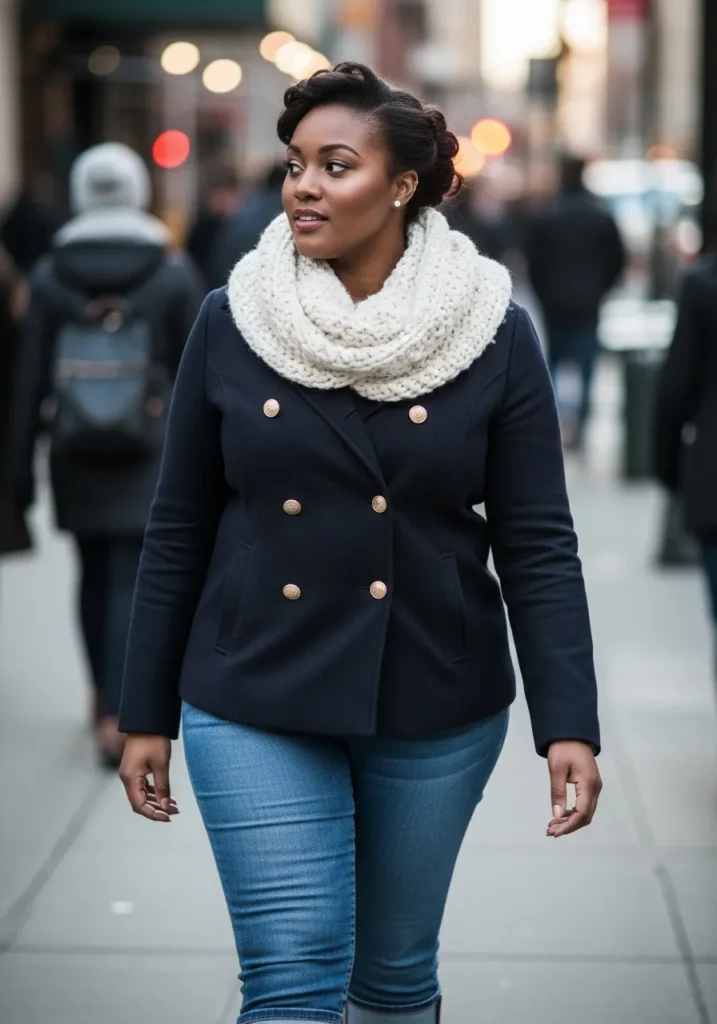 This look pairs a classic navy peacoat with gold button details and a soft, creamy chunky knit infinity scarf that instantly feels snug and inviting. The coat has a clean, tailored shape that works beautifully with the light wash skinny jeans for a balanced winter silhouette. The overall vibe is polished but still warm and approachable, the kind of outfit that makes city streets feel like your own personal runway on a chilly day.