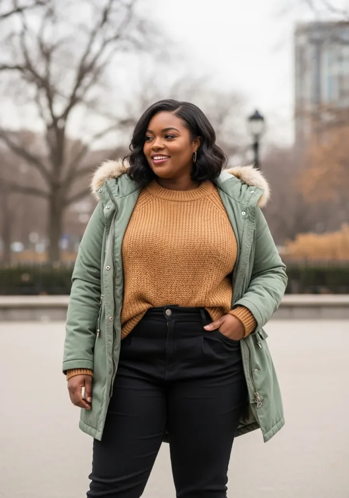 This outfit feels like the kind of winter look you put on when you want to stay warm without losing that cute everyday charm. The soft sage green parka with its fluffy faux fur hood gives the whole look a relaxed, cozy vibe. Underneath, the warm caramel knit sweater adds a rich pop of color that feels perfect for chilly days. The high waisted black jeans pull everything together with a clean shape that keeps the outfit polished while still being super wearable. The mix of textures makes the outfit feel soft, structured, and winter ready all at once.