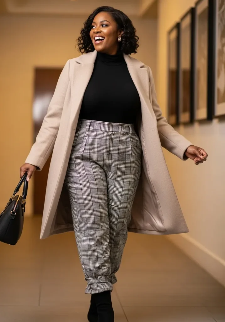 This look brings together polished winter style with the kind of confidence that turns a regular hallway walk into a full runway moment. She wears a sleek black turtleneck that hugs beautifully without feeling tight, paired with tailored high waisted plaid trousers that create a clean structured line. The light beige coat adds that soft winter elegance that always feels luxurious. The fabrics have a mix of warmth and refinement and the whole vibe says modern career woman who knows she looks amazing. The black handbag ties everything together with a classic touch.