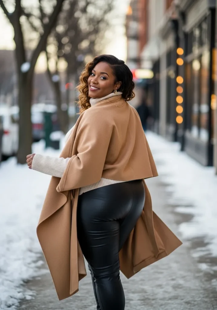 This outfit is such a winter mood with its mix of softness and edge. She is wearing a gorgeous camel wrap coat that flows beautifully behind her with every step. Underneath, the chunky cream turtleneck adds that cozy texture we all love when the weather turns frosty. The black faux leather leggings pull everything together with a sleek, sculpted look that makes the warm neutral tones pop even more. The whole vibe feels polished, confident, and perfect for a casual city stroll on a snowy day.