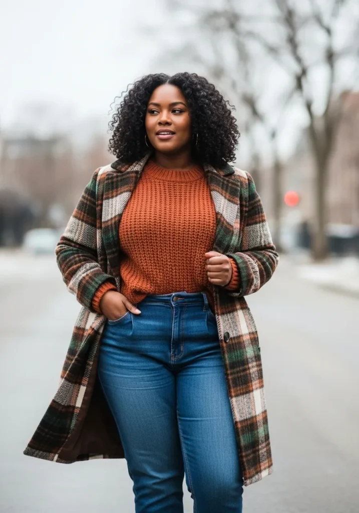 This look blends winter warmth with easy everyday charm. The rich rust knit sweater brings a soft textured feel that pairs beautifully with the structured plaid coat in earthy greens and browns. The high rise blue jeans keep everything sleek and balanced while the longer coat adds that effortless street style vibe. The whole outfit feels polished but still relaxed enough for a casual winter stroll.