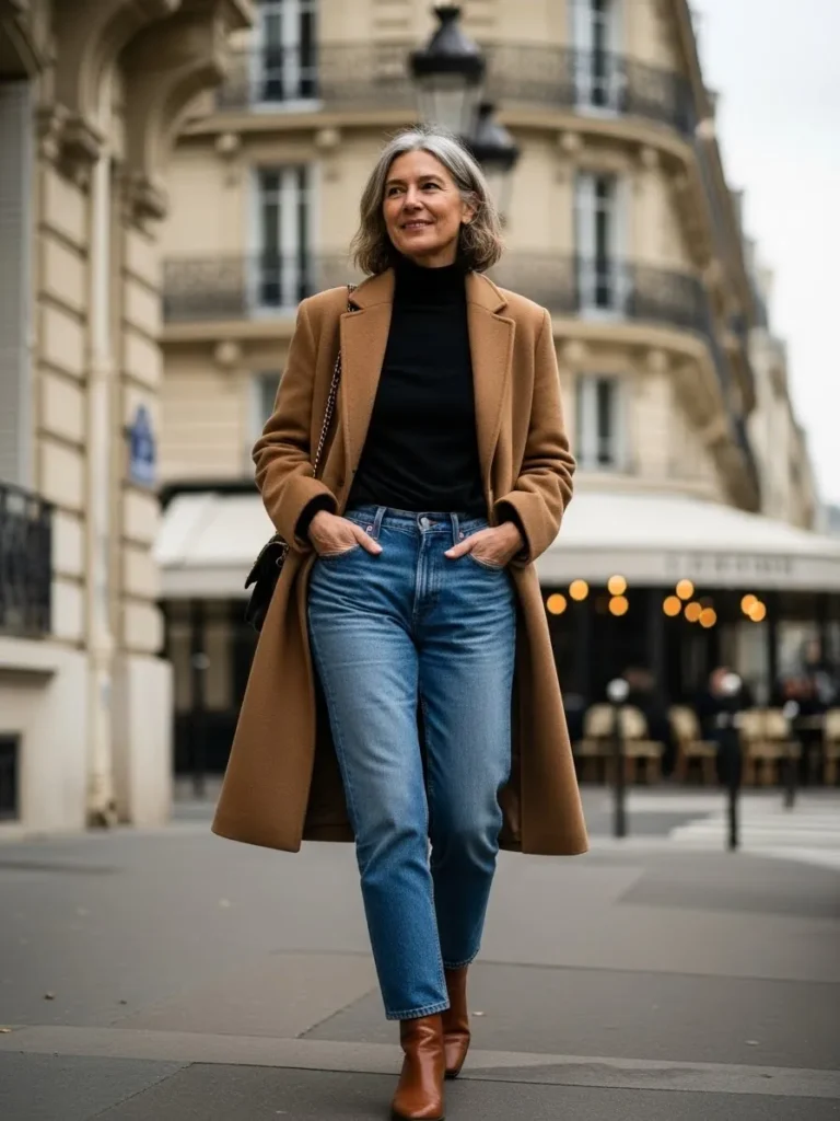 This outfit pairs a tailored camel coat with a simple black top and classic blue jeans for an effortless city look.