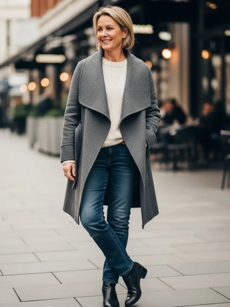 This look combines a tailored gray coat with a simple light sweater and slim blue jeans.