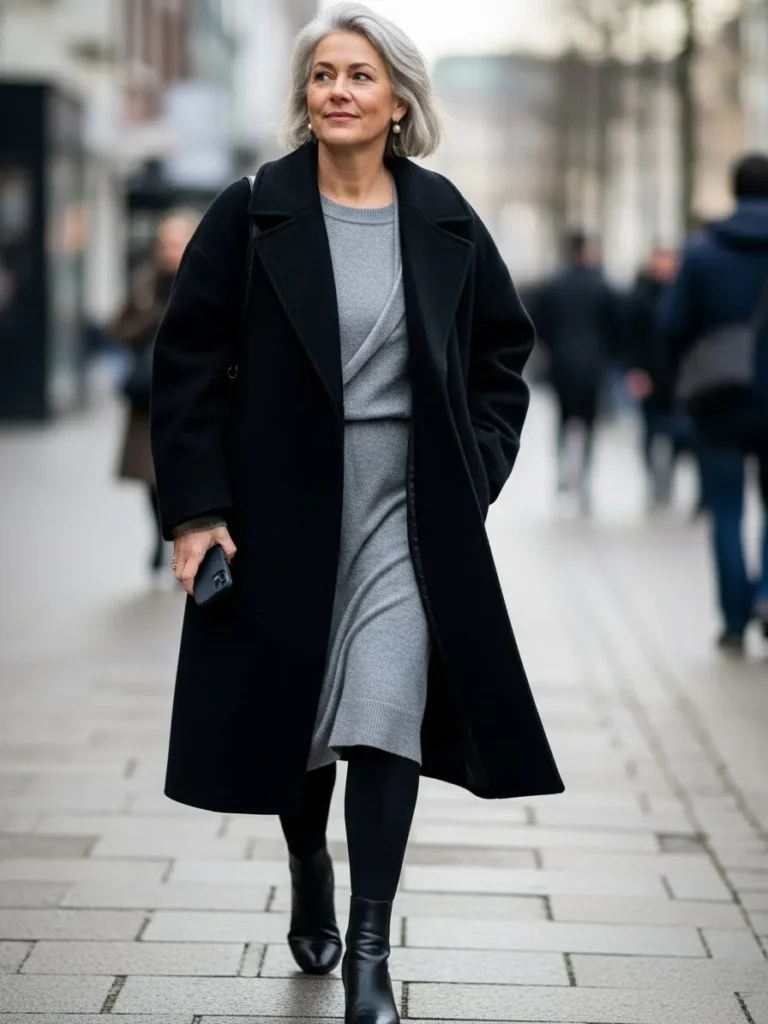 A long black coat is layered over a light gray sweater dress and finished with sleek ankle boots.