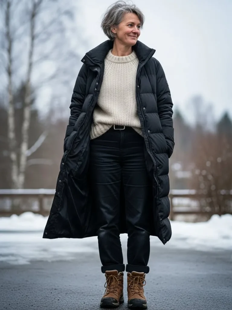 A long black puffer coat is paired with a chunky cream sweater, dark pants, and warm boots.