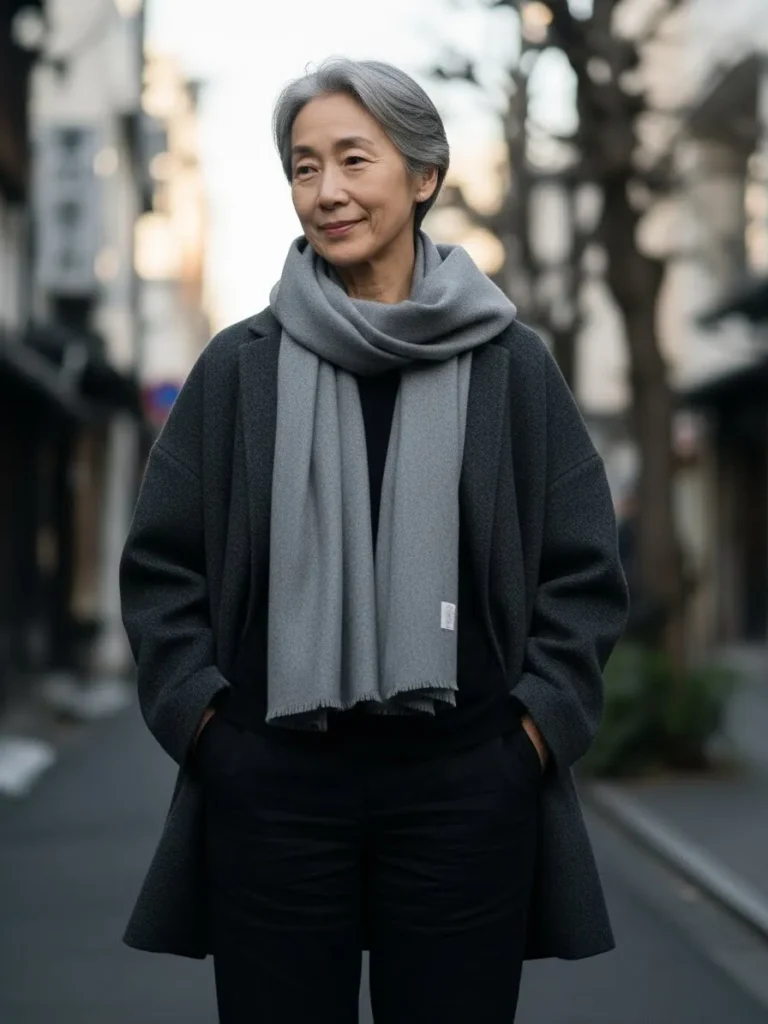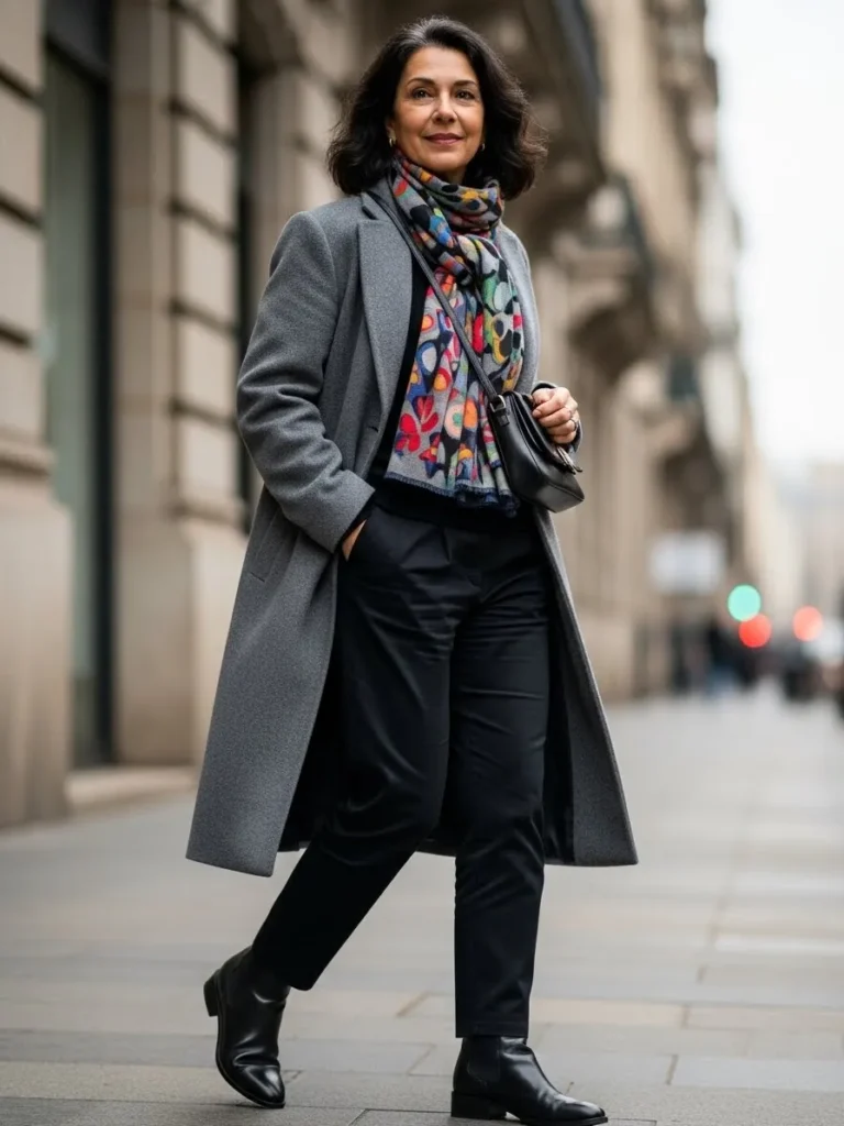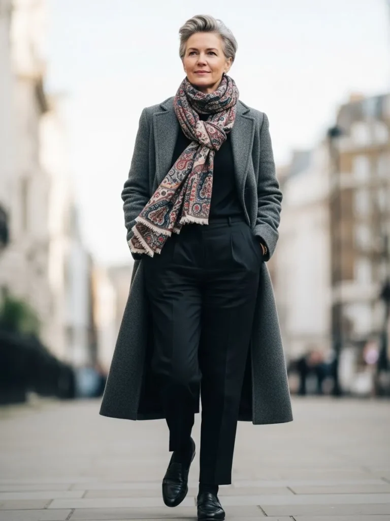 This outfit features a structured gray coat worn over black trousers and a patterned scarf.