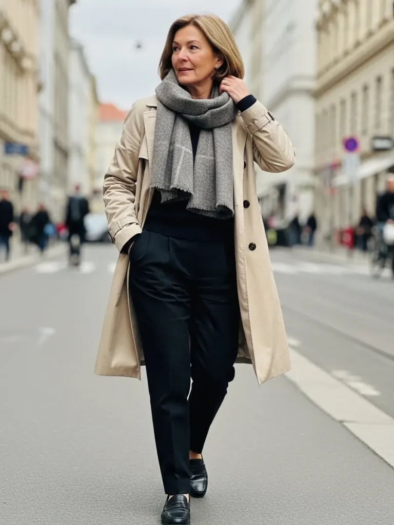 A light beige trench coat is styled with a gray scarf, black trousers, and sleek shoes for a polished cold weather outfit.