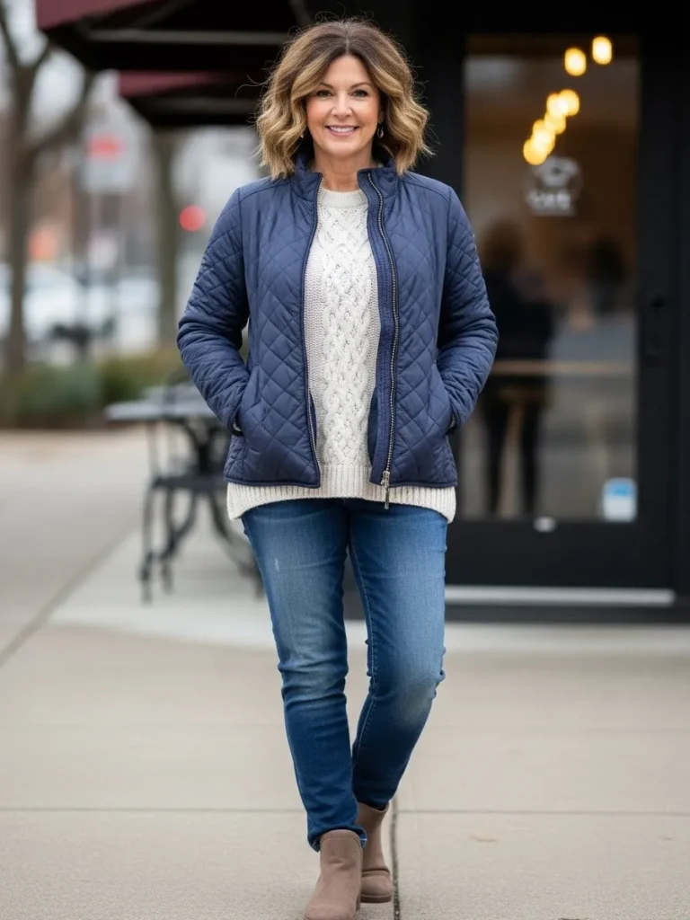 A lightweight quilted jacket is styled over a cozy knit sweater and slim jeans for an easy cold weather outfit.