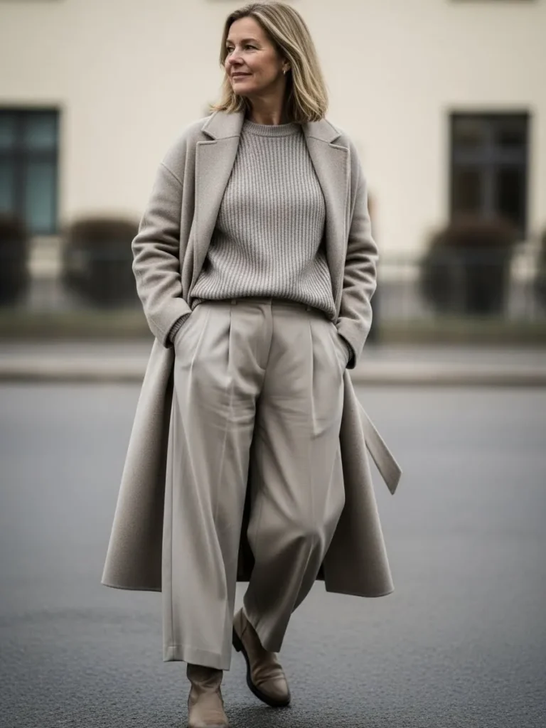 The matching tones feel elegant, and the scarf adds warmth without overpowering the look.