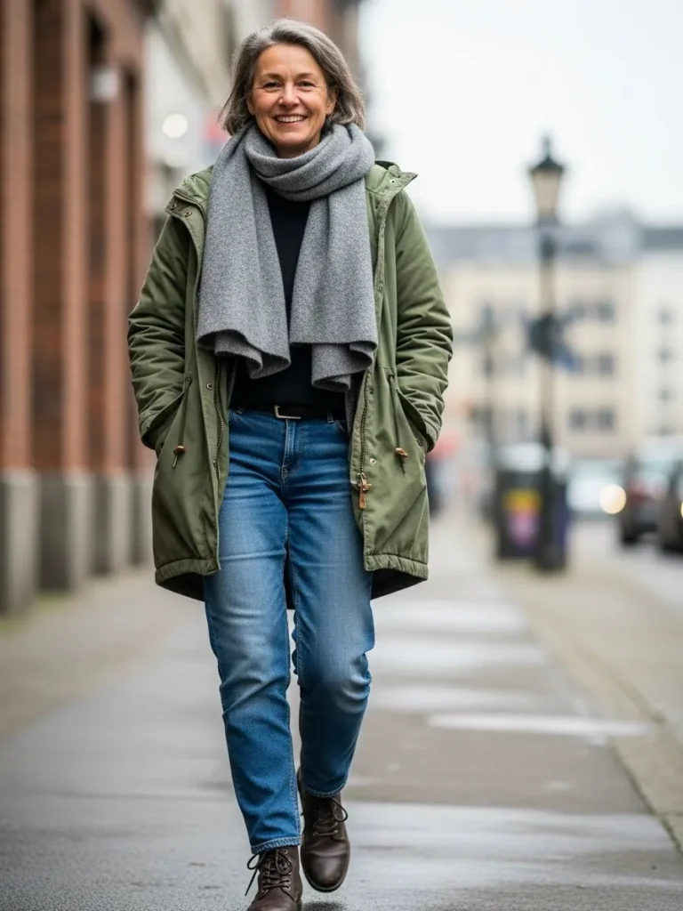 An earthy green coat is styled with a chunky sweater, slim pants, and a long scarf for a relaxed outdoor feel.