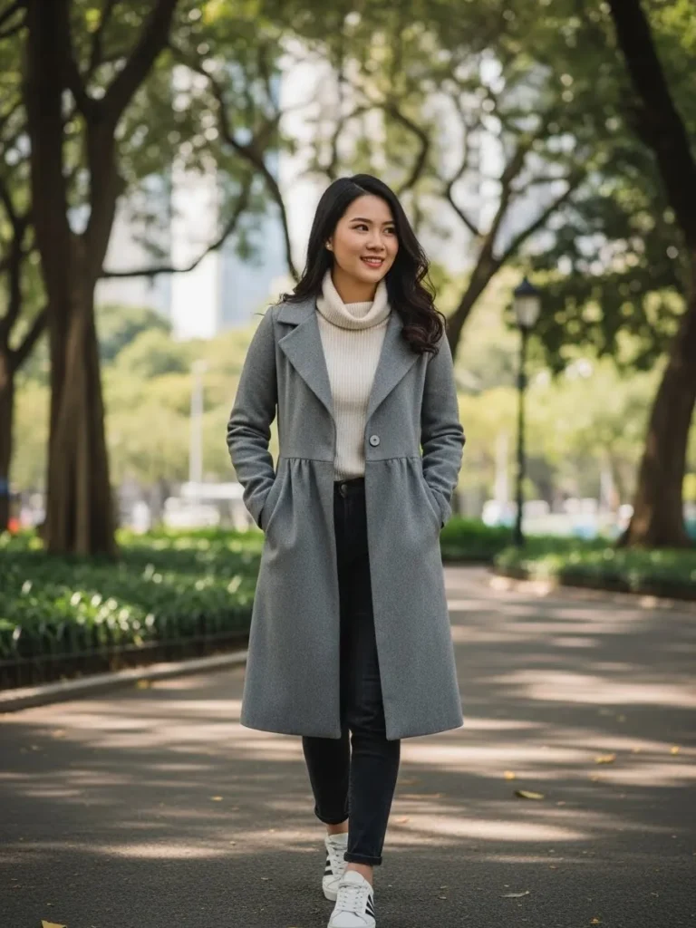 A light gray wool coat layered over a chunky cream turtleneck instantly sets a cozy but refined tone.