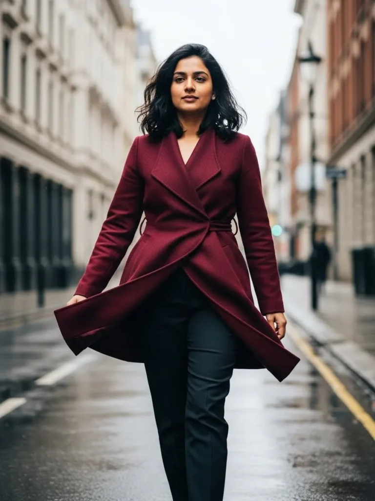 A deep burgundy tailored coat paired with dark trousers creates a bold and confident cold weather work outfit.
