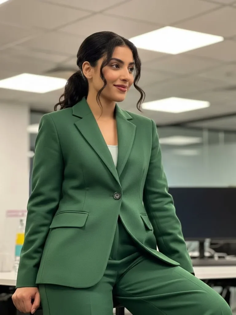 A deep green tailored suit paired with a light neutral top creates a bold but elegant office outfit.