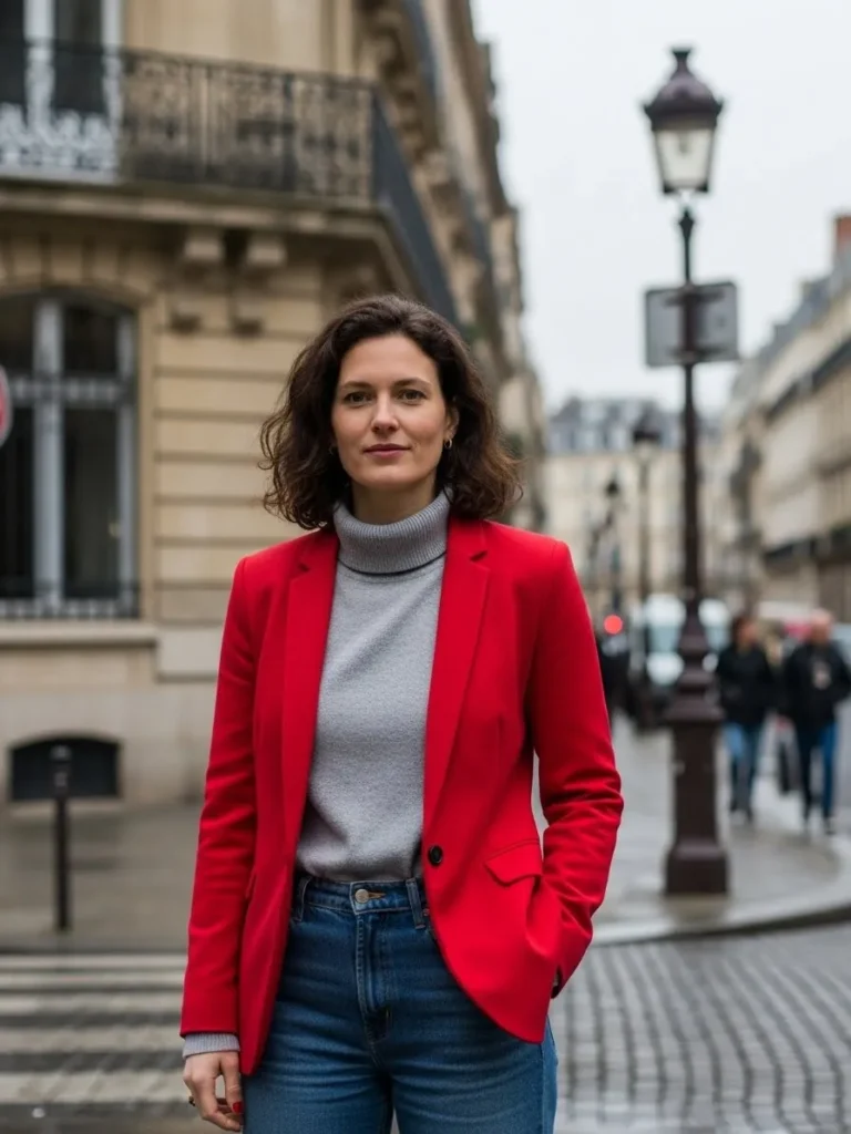 A bold red blazer worn over a gray turtleneck creates a confident contrast that instantly stands out.