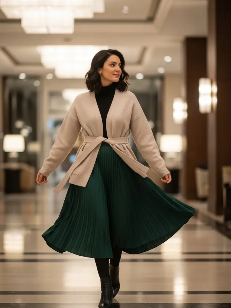 A soft beige belted knit cardigan layered over a black turtleneck pairs beautifully with a deep green pleated midi skirt.