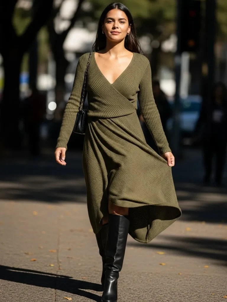 A deep olive ribbed knit wrap dress paired with sleek black knee high boots creates a chic and feminine work outfit.