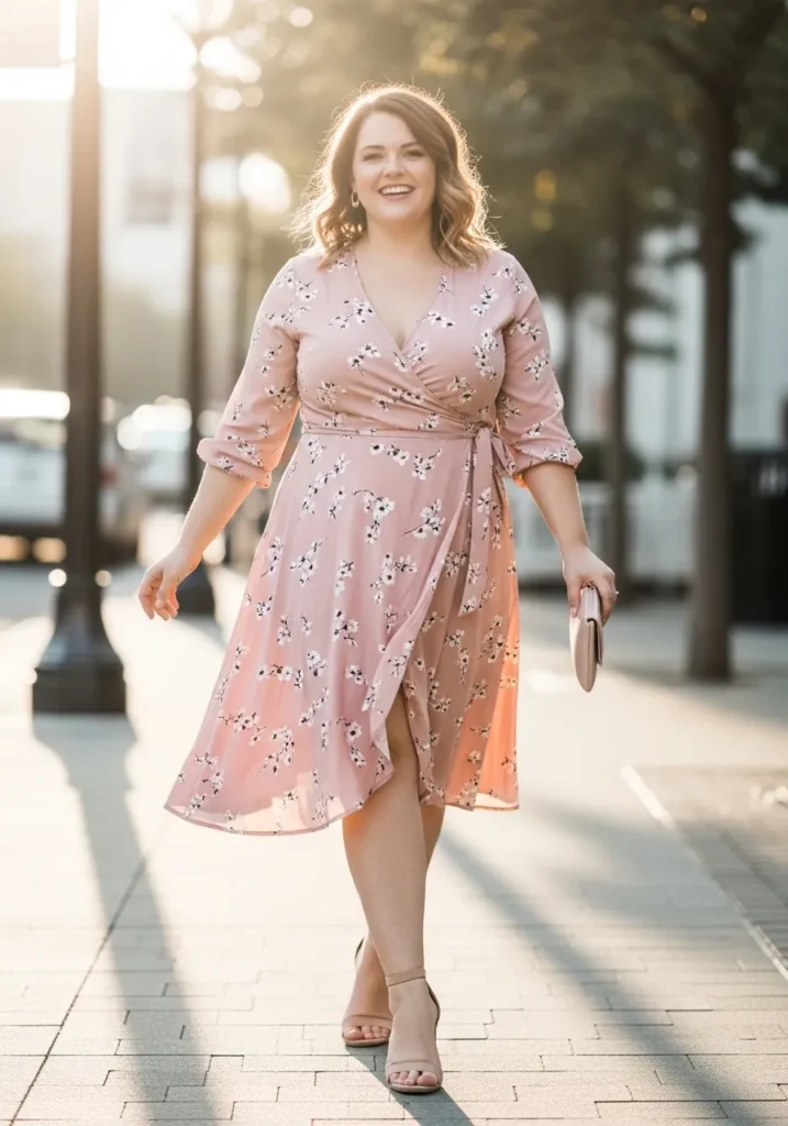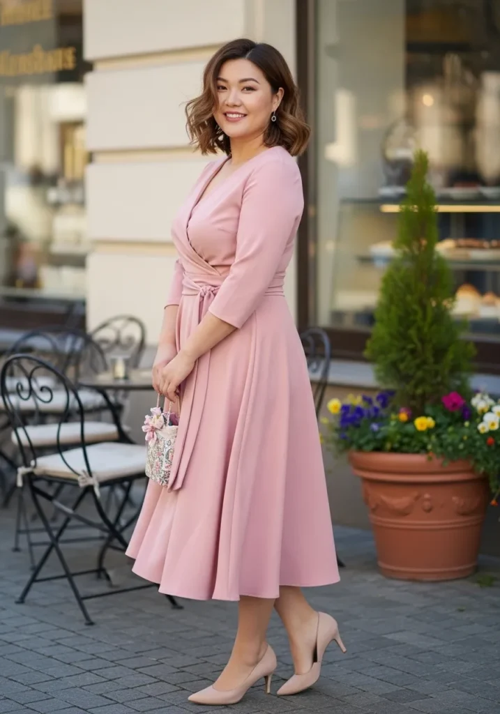 A dusty blush wrap dress creates a timeless and polished look that feels perfect for spring birthdays. The wrap design gently highlights curves while the midi length keeps the outfit balanced and refined. Nude heels and a small clutch add just the right amount of sophistication.