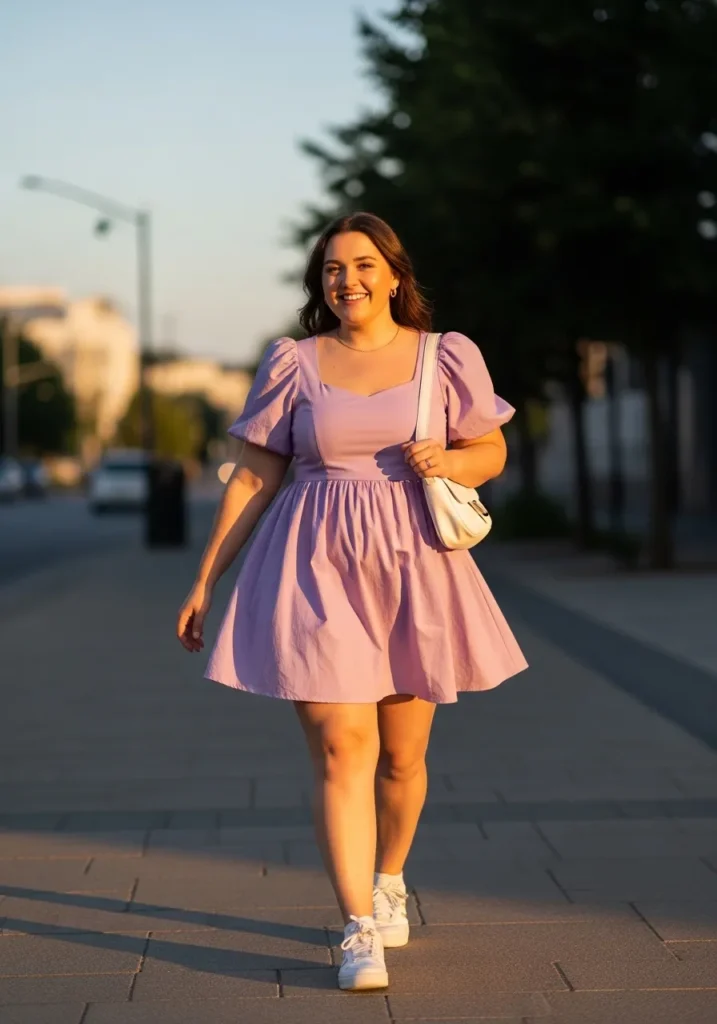 A soft lilac mini dress with puff sleeves creates a playful and youthful spring outfit. The lightweight fabric moves easily and the relaxed silhouette gives it a breezy and comfortable feel. Casual sneakers add a modern twist that keeps the look light and effortless.