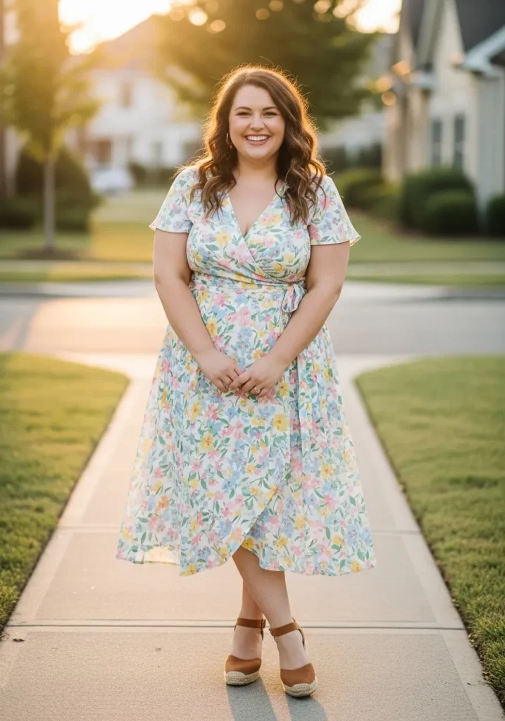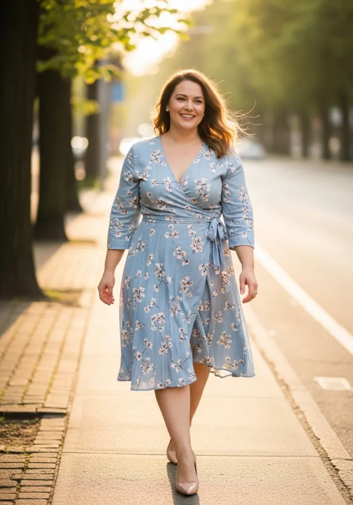 A light blue wrap dress with delicate floral patterns creates a soft and romantic look that feels perfect for spring. The wrap design highlights curves beautifully while the fabric drapes gently as you move. Neutral heels keep the outfit simple and polished while the golden hour lighting adds warmth.