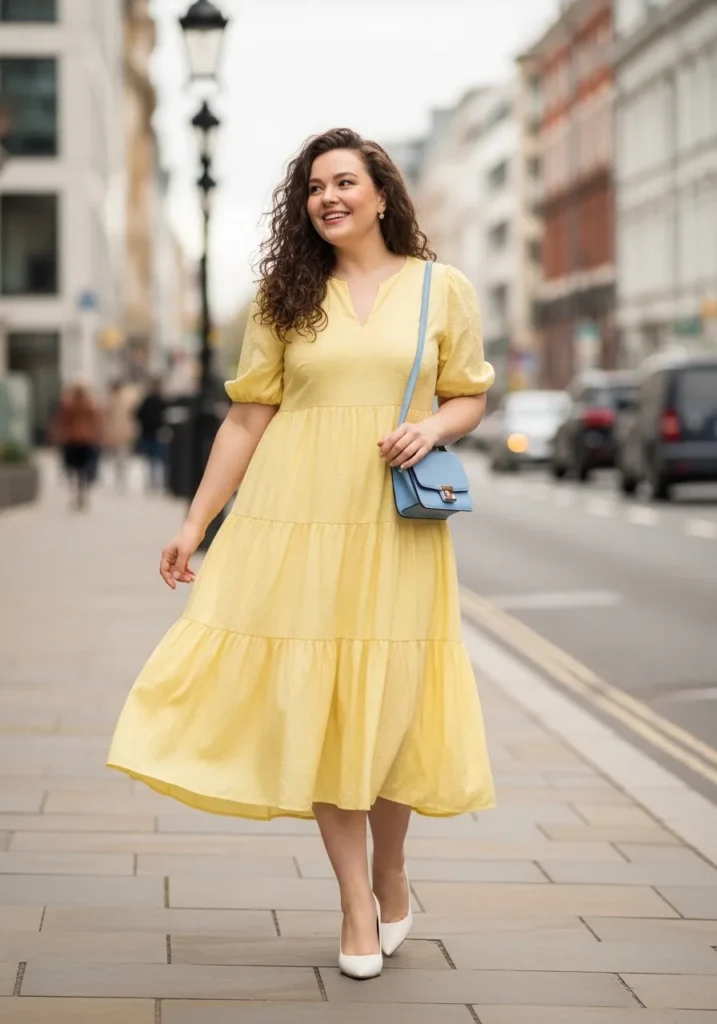 A soft butter yellow midi dress with a relaxed flowy silhouette brings instant sunshine to this spring birthday outfit. The lightweight fabric moves beautifully with every step, while the short sleeves and airy skirt make it feel breezy and comfortable. White heels and a small pastel handbag keep the look light and polished as she strolls through a charming city street.