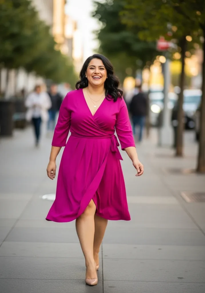This vibrant pink wrap dress is full of confident birthday energy. The wrap style creates a beautiful shape while the flowing skirt moves naturally as she walks through the city. Nude heels keep the outfit elegant and balanced while the bold color takes center stage.