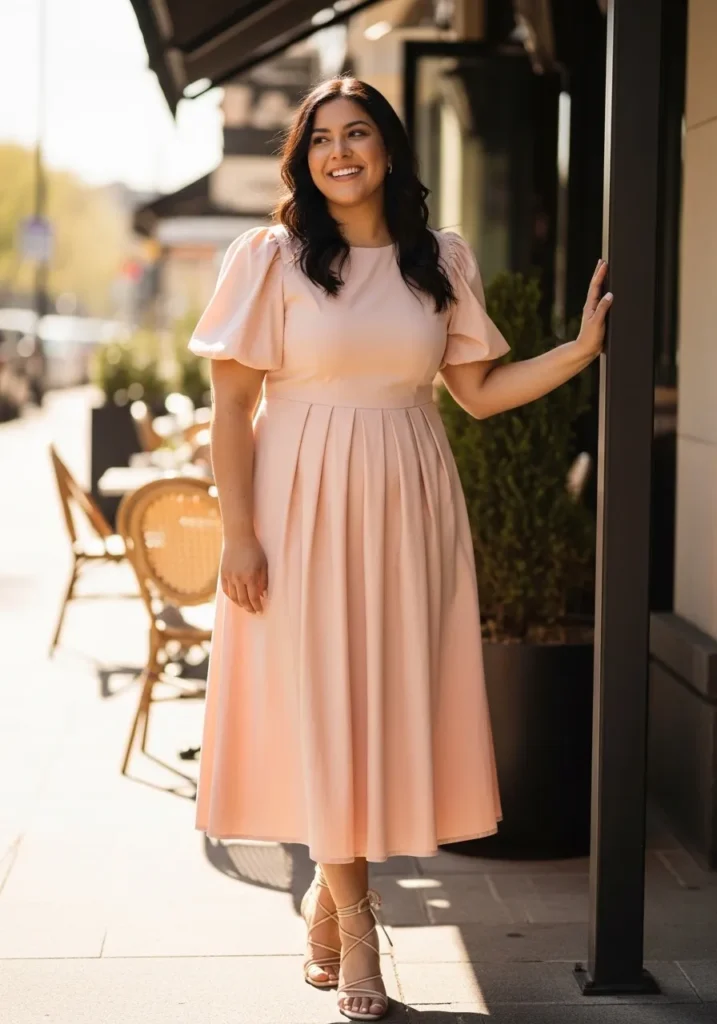 This soft peach pink midi dress has a beautifully relaxed silhouette that feels elegant yet comfortable. The short sleeves and flowing skirt create gentle movement while the lightweight fabric gives it that airy spring feeling. Neutral heels keep the outfit refined while the café background adds a cozy birthday outing vibe.