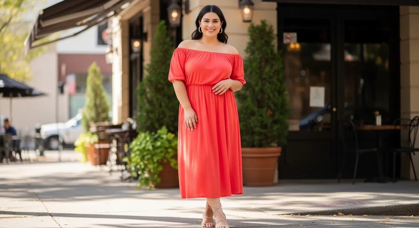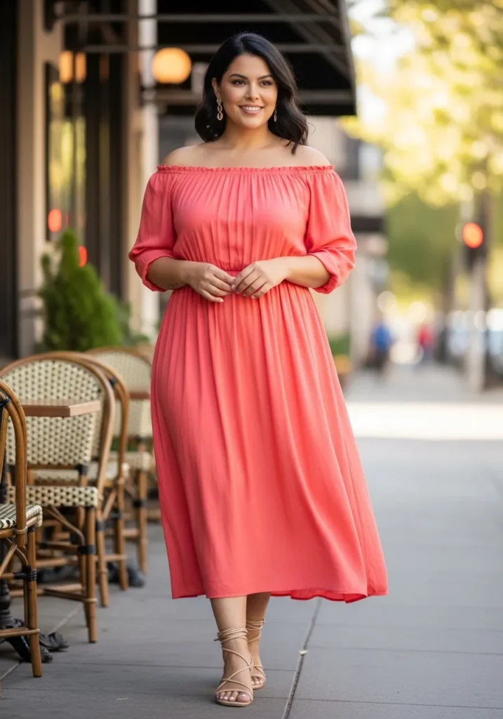 This bright coral off shoulder dress is the definition of cheerful spring style. The flowy midi length and soft gathered neckline create a relaxed but polished silhouette that moves beautifully. Neutral heels keep the look balanced while the outdoor café setting adds a casual yet celebratory feel.